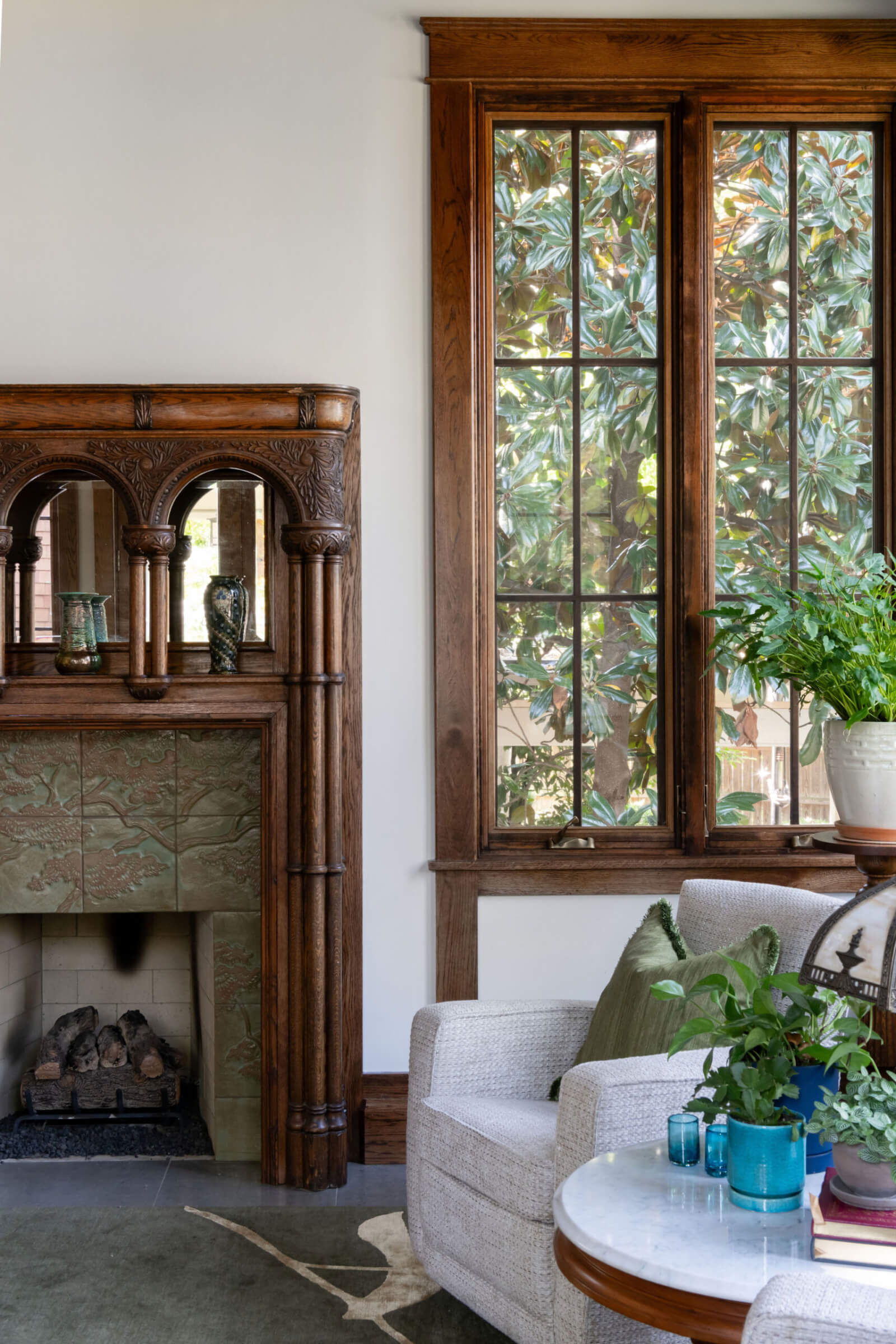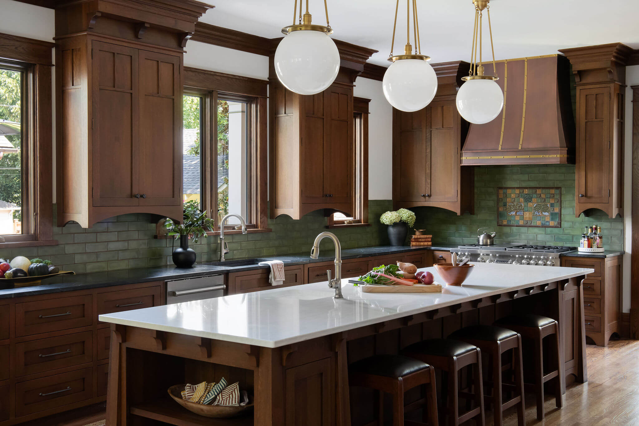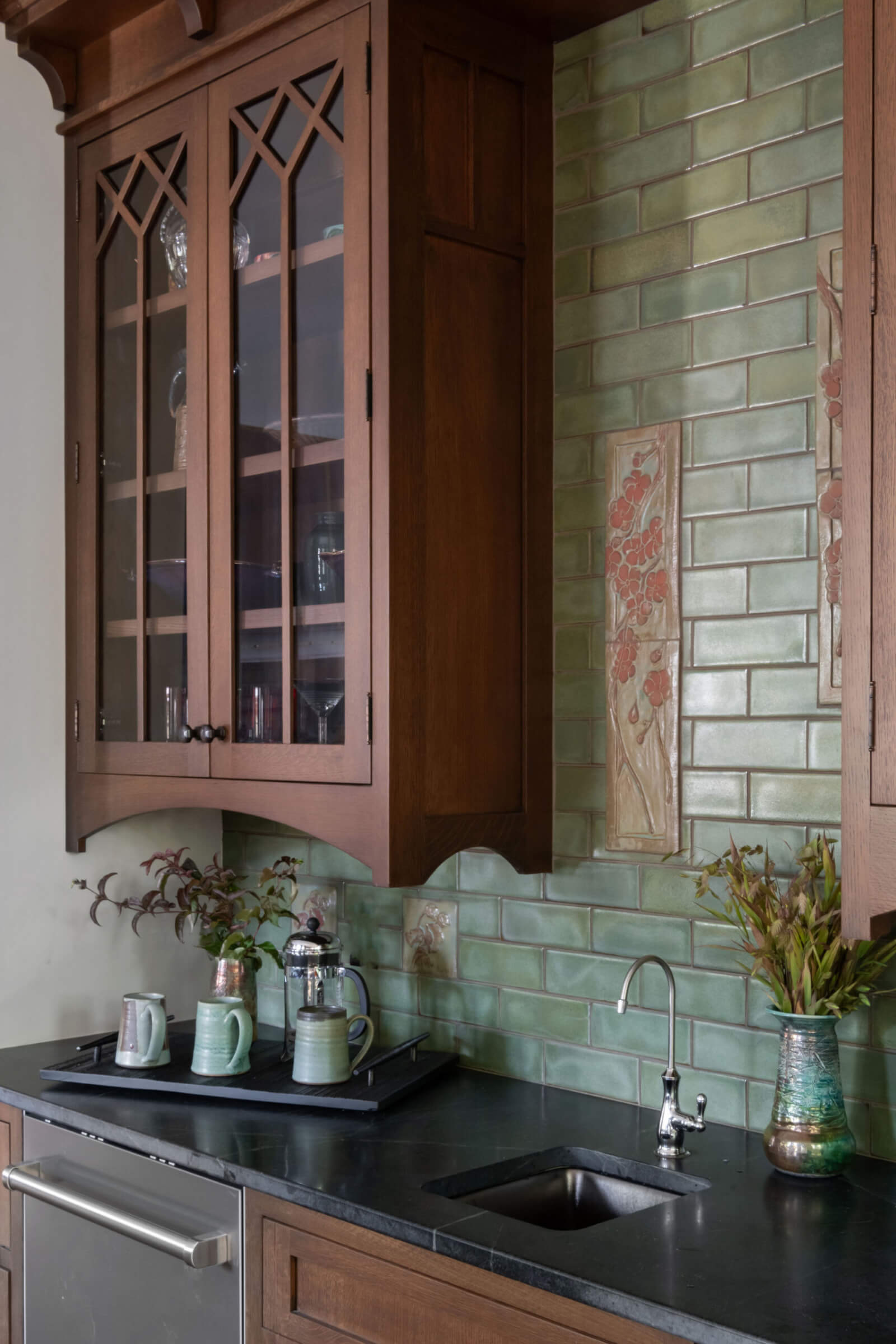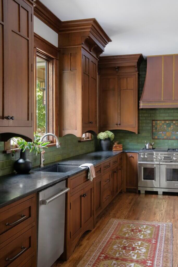 For our nature loving clients, the design goal was to integrate all the function and amenities of a modern home into their quintessential 1928 American Foursquare home. This objective was accomplished by honoring the existing hand-crafted wood detailing throughout the home and thoughtfully replicating those details into the newly added kitchen and sunroom. To further enhance the home’s cohesive design, we sourced custom tile for both the fireplace and kitchen backsplash from a manufacturer specializing in craftsman-style pieces. A tree motif in earthy green tones was chosen to complement the natural color palette woven throughout the home. Finishing touches included era-appropriate light fixtures and soft paint colors that highlight the rich, dark trim. These details carefully curated throughout the home now beautifully showcase both its craftsman influences and the clients’ deep love of nature.