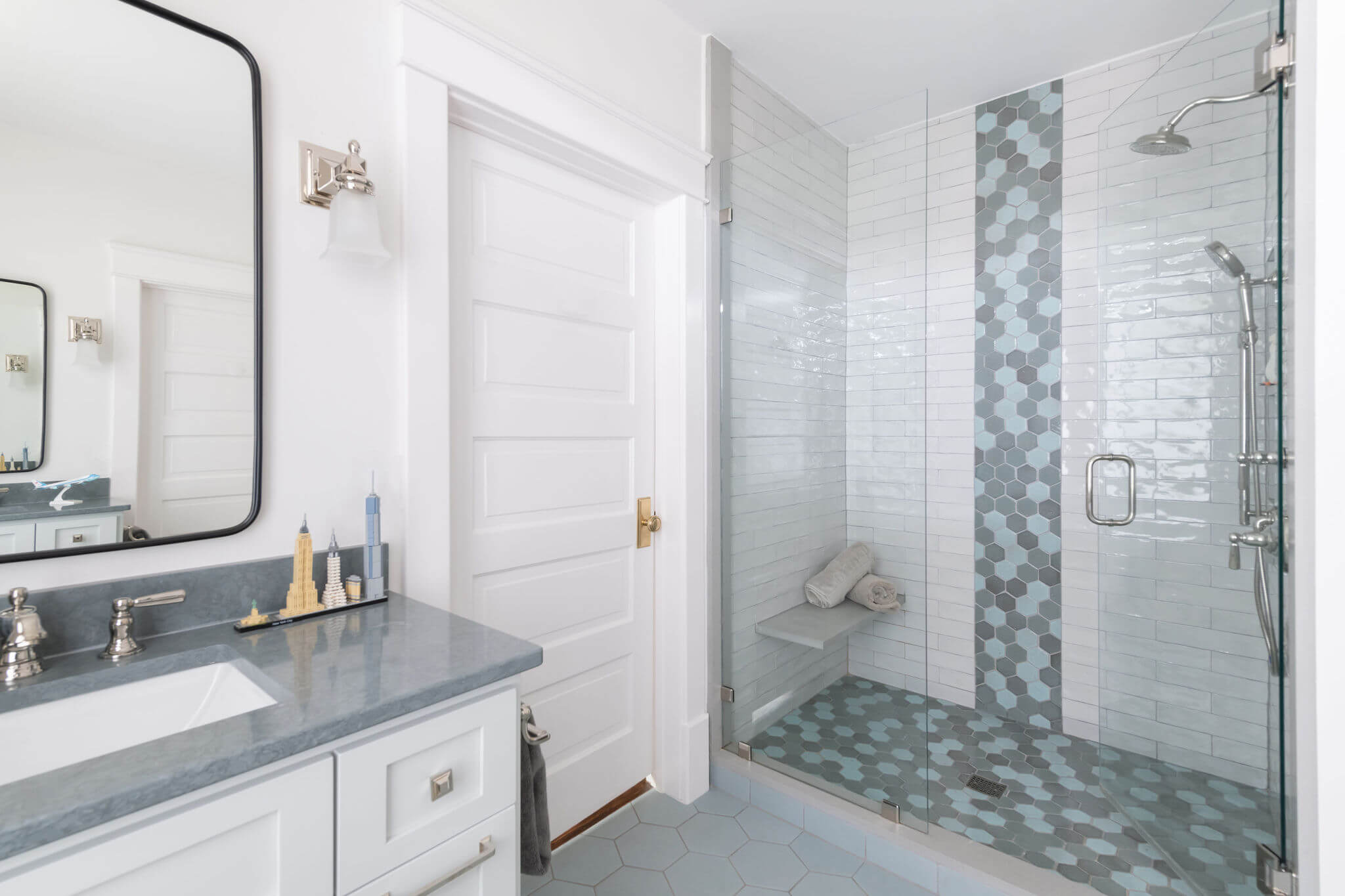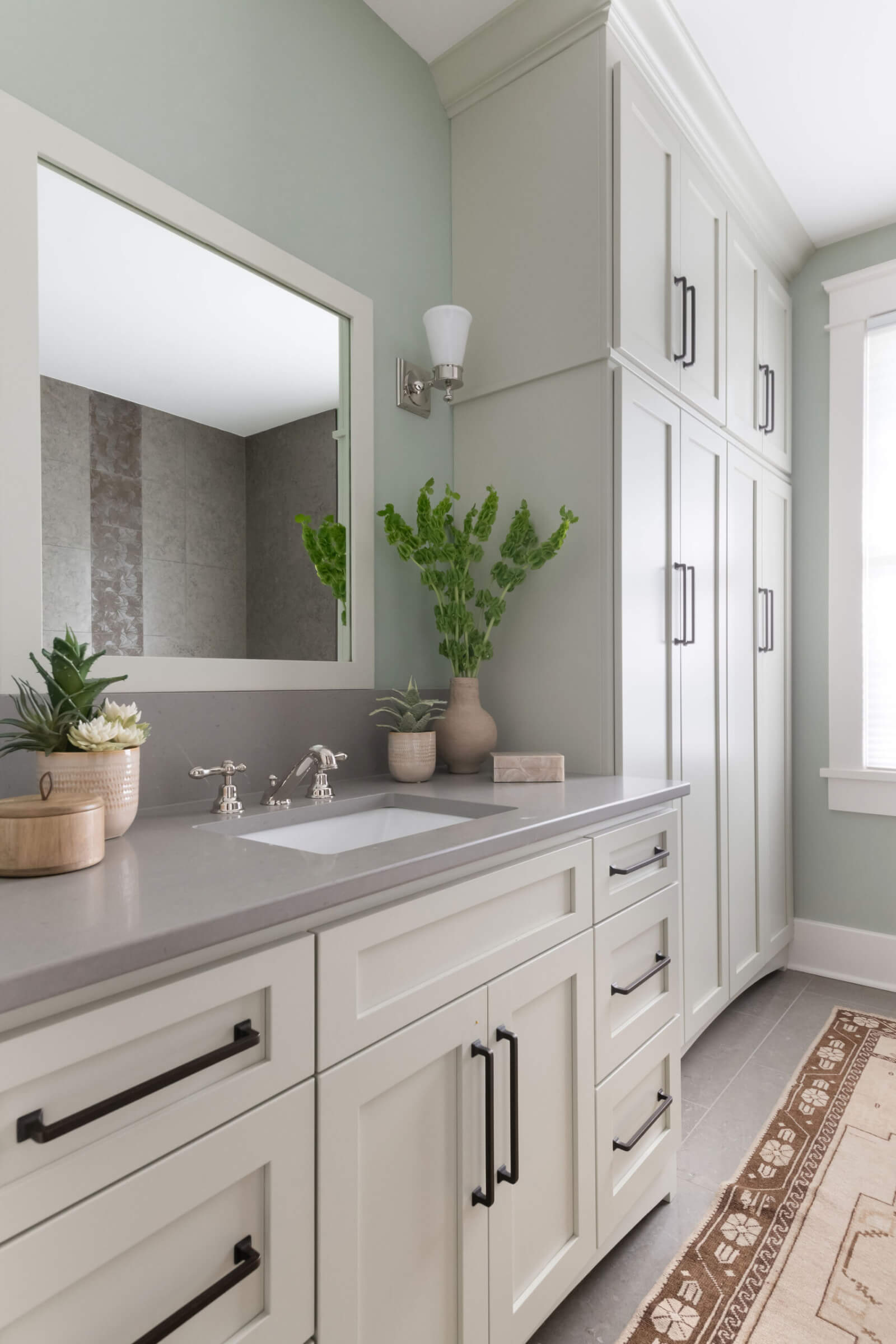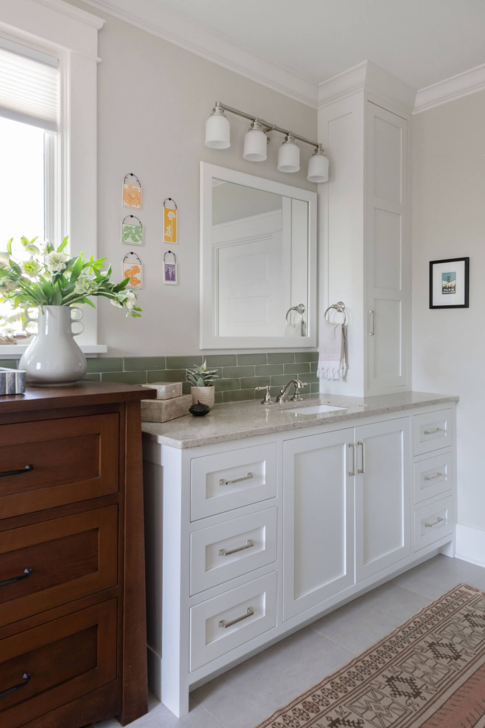 For our nature loving clients, the design goal was to integrate all the function and amenities of a modern home into their quintessential 1928 American Foursquare home. This objective was accomplished by honoring the existing hand-crafted wood detailing throughout the home and thoughtfully replicating those details into the newly added kitchen and sunroom. To further enhance the home’s cohesive design, we sourced custom tile for both the fireplace and kitchen backsplash from a manufacturer specializing in craftsman-style pieces. A tree motif in earthy green tones was chosen to complement the natural color palette woven throughout the home. Finishing touches included era-appropriate light fixtures and soft paint colors that highlight the rich, dark trim. These details carefully curated throughout the home now beautifully showcase both its craftsman influences and the clients’ deep love of nature.